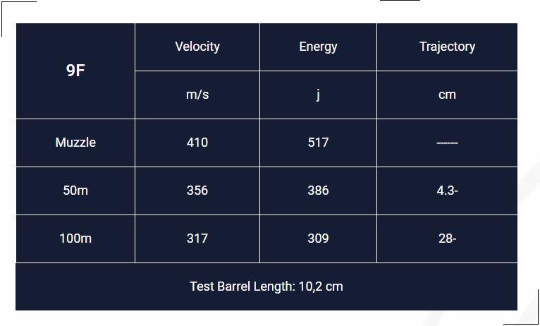 En hurtig pistolammunition med let projektil - 95 gr. God til bane og terræn skydning. 410 m/s. - jacketed soft point.