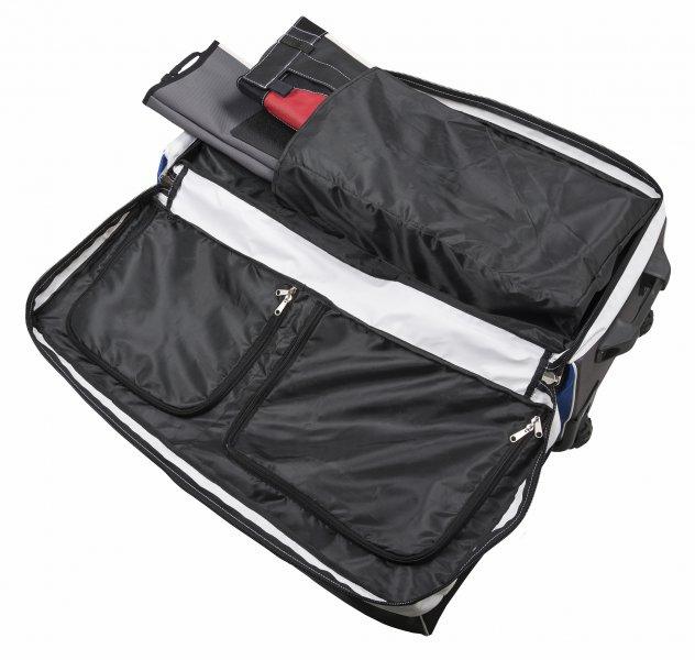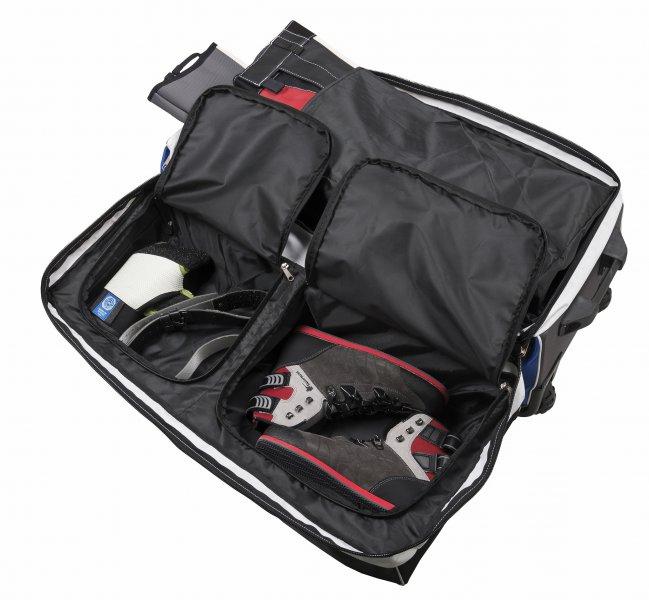 Stor sportstaske med meget solide hjul med separate rum til jakke, bukser, støvler og tilbehør. Med bærehåndtag og kodelås.