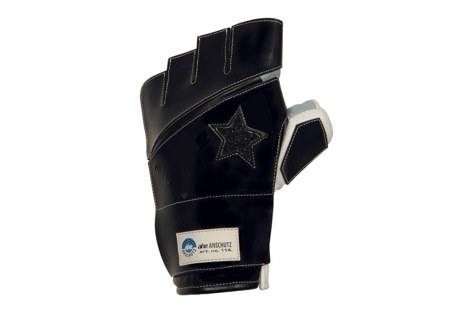 Fingerløs skydehandske med elastik ved håndleddet og sort anti-slip beklædning.