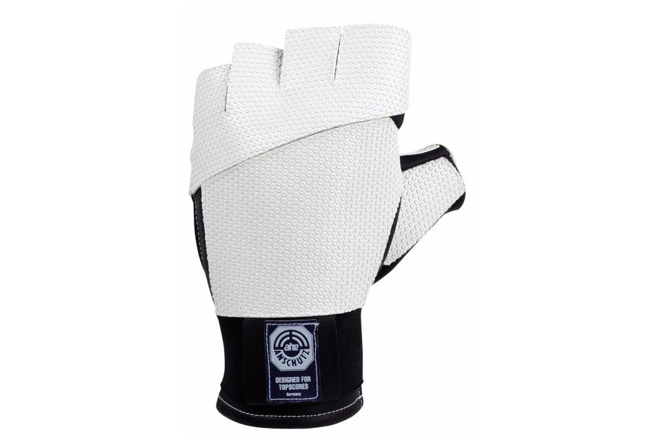 Sort/hvid skydehandske fra AHG i modellen Short Black. Til højreskytter.
