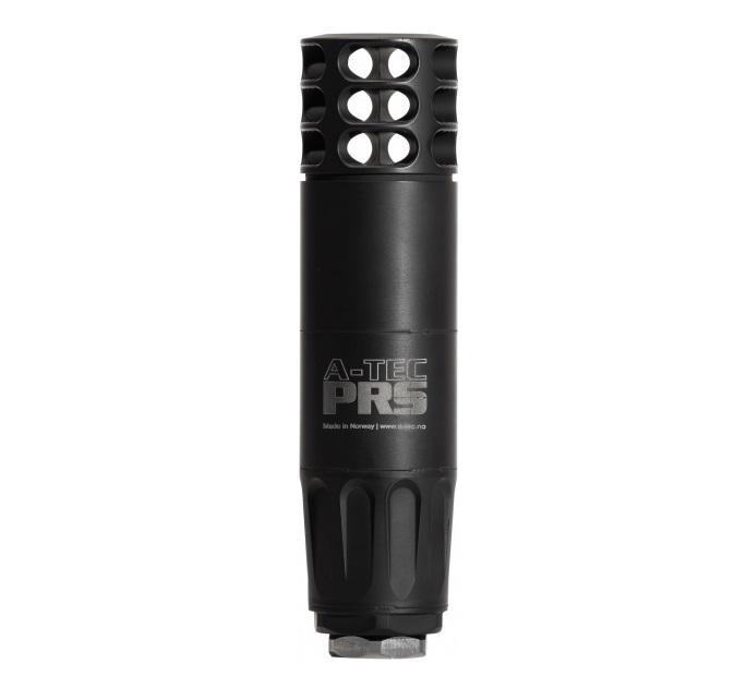 A-tec PRS 2 Module er en hybrid lyddæmper og mundingsbremse, der reducerer støjen med op til 24 dB(C). Den vejer 465 gram og måler 172 mm i længden. Fremstillet af rustfrit stål og belagt med Cerakote, er PRS 2 både holdbar og effektiv til lyd- og rekylreduktion.