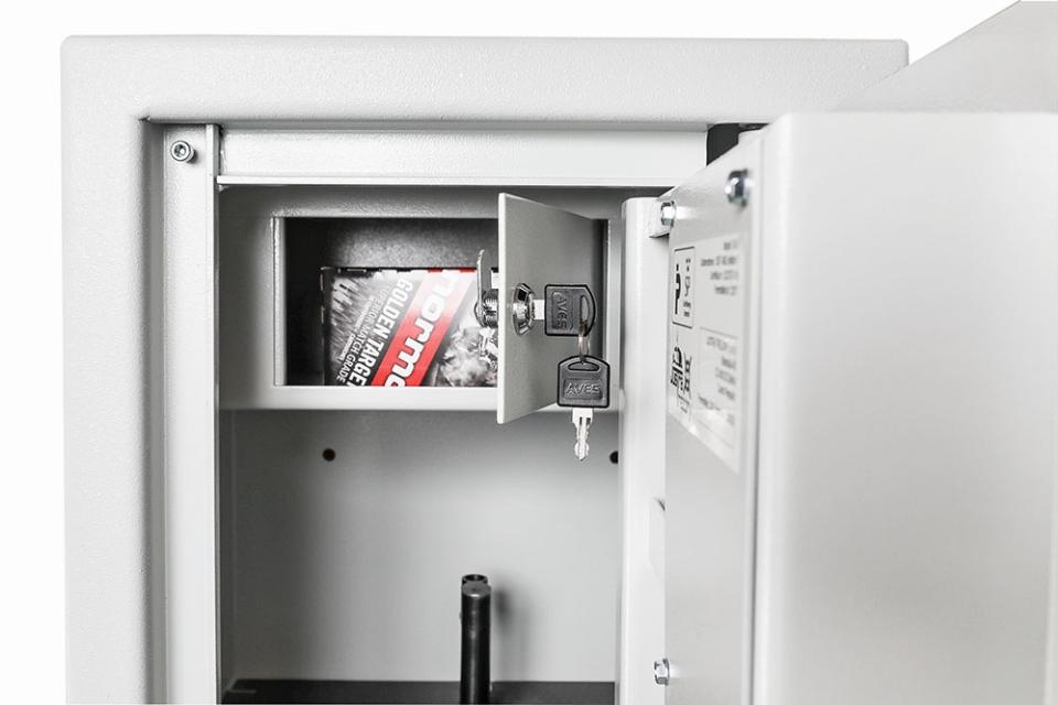 Lille våbenskab med topboks, der kan låses med nøgler.