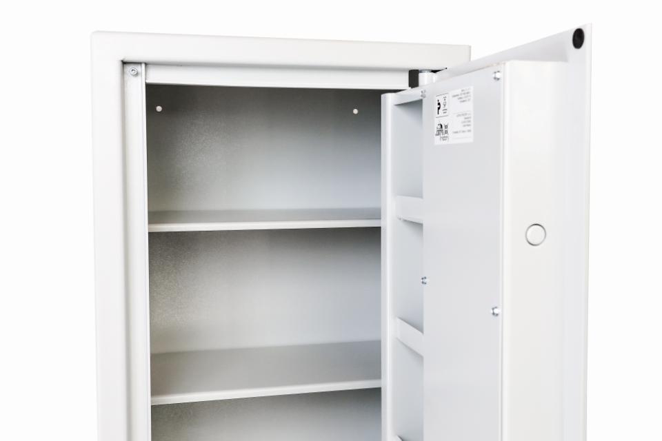 Sikringsskab med 4 flytbare hylder og elektronisk kodelås.